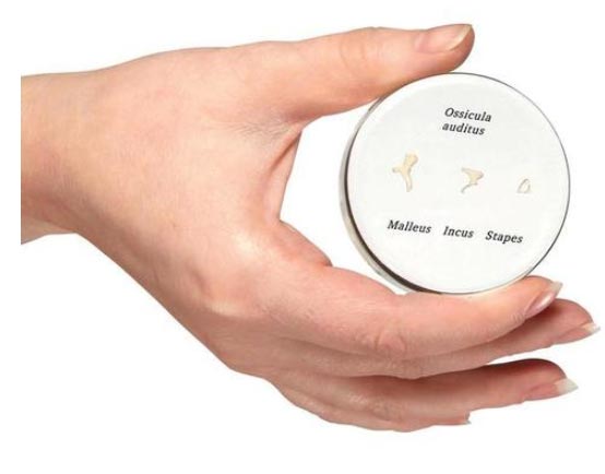 Gli ossicini dell’orecchio umano sono inseriti uno per uno in materiale plastico trasparente.