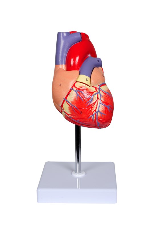 Grandezza naturale in 2 parti. La parete cardiaca anteriore può essere rimossa per mostrare i ventricoli e gli atri destro e sinistro e le valvole tricuspidale, polmonari, mitrali e aortiche.