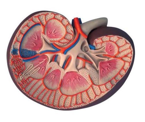 Sezione longitudinale del rene destro con rappresentazione di tutte le strutture importanti