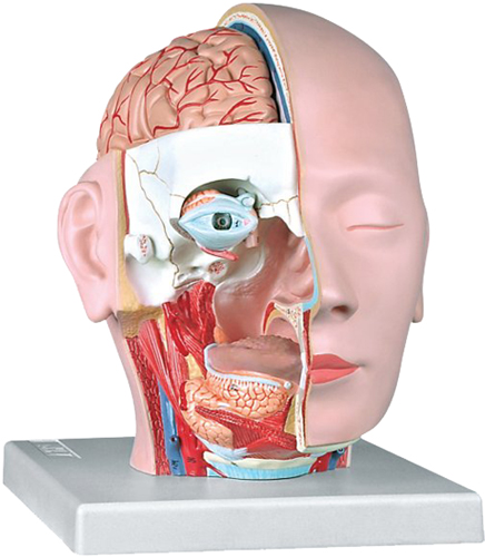 Il lato destro della faccia è sezionato lungo la linea orizzontale e sagittale. Questo modellino anatomico molti dettagli significativi del cervello a del cranio assieme all'intera cavità oro-nasale.
