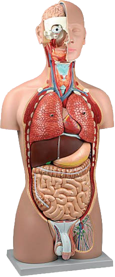 Le seguenti strutture rimovibili fanno parte della dotazione del modellino anatomico: • Metà cervello, sezionato lungo la fessura longitudinale, completo di strutture interne e vasi sanguigni • Occhi con nervo ottico e muscoli extra oculari • Aorta toracica discendente ed esofago • Polmone destro e sinistro, mostrano albero bronchiale ed elementi vascolari • Cuore in due parti che illustra atri, ventricoli e valvole cardiache e la sezione attraverso il muro ventricolare del cuore. • Metà rene (sezionato lungo il piano frontale per mostrare al meglio le strutture interne e i vasi sanguigni) • Rene, uretra e vescica, con prostata (rimovibile in due parti) • Stomaco, visualizza strutture muscolari e vascolari • Pancreas, duodeno e milza con vasi sanguigni e condotti • Fegato con cistifellea • Intestino retto e crasso con copertura rimovibile che rivela la struttura interna dell'intestino cieco • Organi urogenitali maschili e femminili (ognuno in 4 parti) sezionati lungo la linea mediana