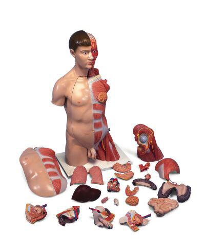 La metà destra mostra la pelle, la metà sinistra mostra la muscolatura superficiale e profonda con nervi, vasi sanguigni e strutture ossee. La poliedricità di questo modelllo è completata dalla riproduzione precisa degli organi interni e dal braccio con muscoli scomponibile in 6 parti.