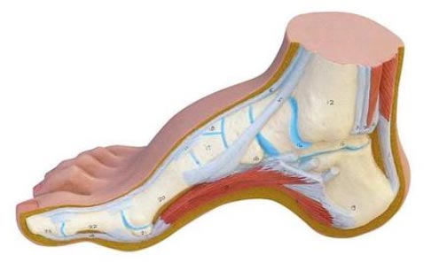Modello di piede cavo destro che mostra, oltre alle strutture superficiali, anche ossa, muscoli e legamenti interni