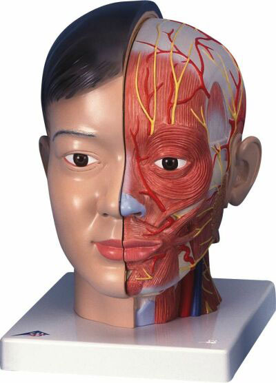 Modello su base, a sezione mediana e grandezza naturale con la parte sinistra che mostra la muscolatura con nervi, vasi e strutture ossee. La metà di cervello è estraibile. La testa è montata su una parte di collo staccabile, tagliata sia orizzontalmente che trasversalmente.
