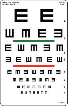Tavola ottometrica di Tumbling per acuità visiva con lettera "E" e barra a colori.