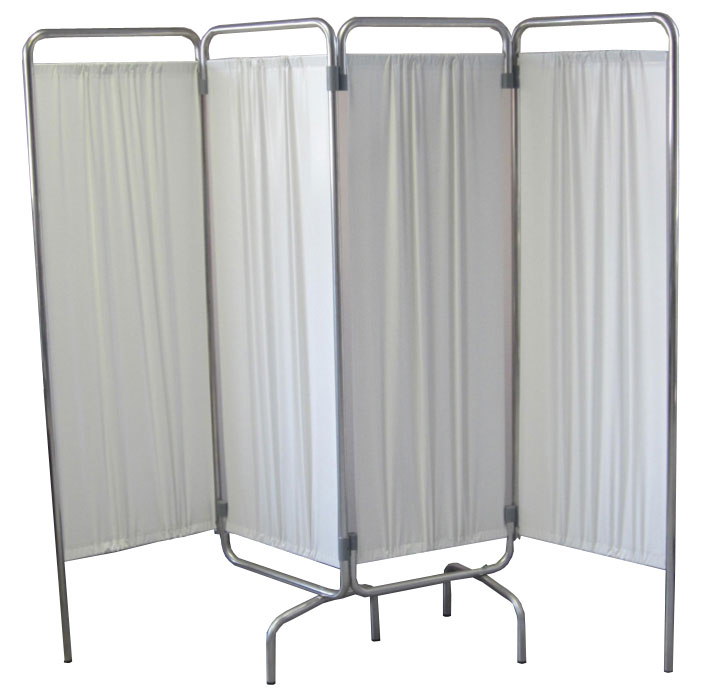 Paravento a 4 sezioni con struttura tubolare in itallumag e tende bianche, pieghevoli e lavabili, in plastica, con ritardante di fiamma.