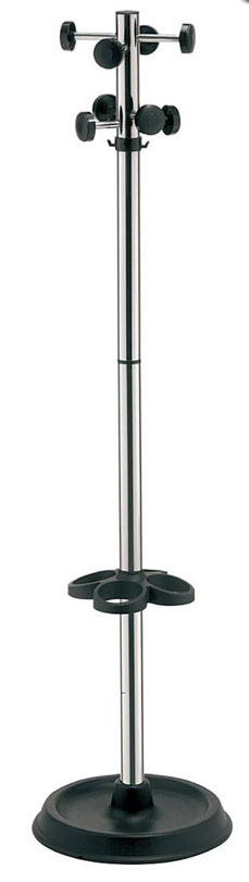 Appendiabiti a 8 rami con struttura tubolare in acciaio cromato. Basamento pesante e portaombrelli.