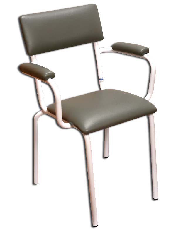 Poltroncina con sedile imbottito, schienale e braccioli e struttura tubolare itallumag. Accatastabile.