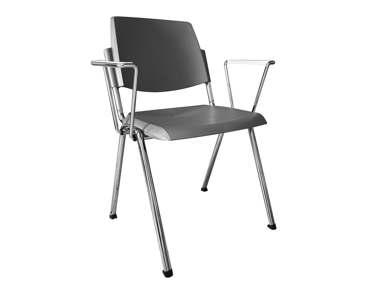 Sedia impilabile con braccioli e struttura in acciaio cromato e seduta in plastica autoestinguente Classe I.