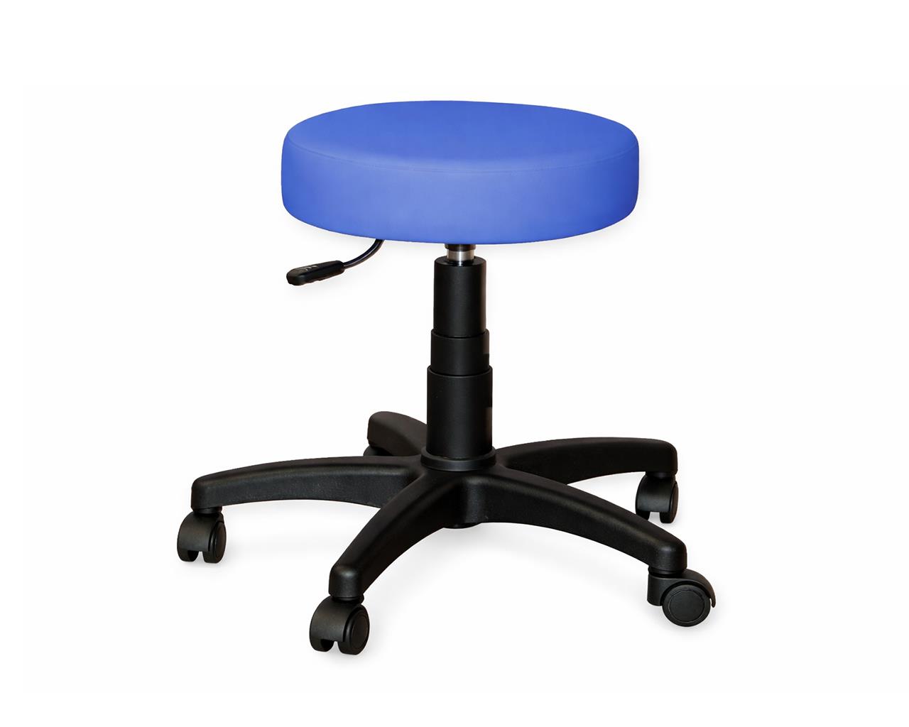 Sgabello regolabile in altezza con sedile imbottito in finta pelle e base in plastica con 5 ruote.