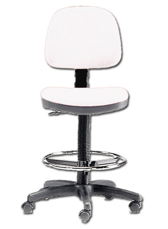 Sgabello con sedile e schienale imbottiti con materiale in finta pelle ignifugo. Regolabile in altezza. Base in plastica con 5 ruote e anello cromato.
