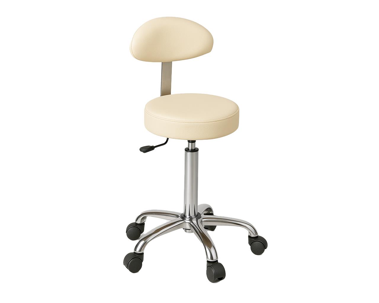 Sgabello in metallo, regolabile in altezza, con sedile e schienale imbottiti e rotelle.