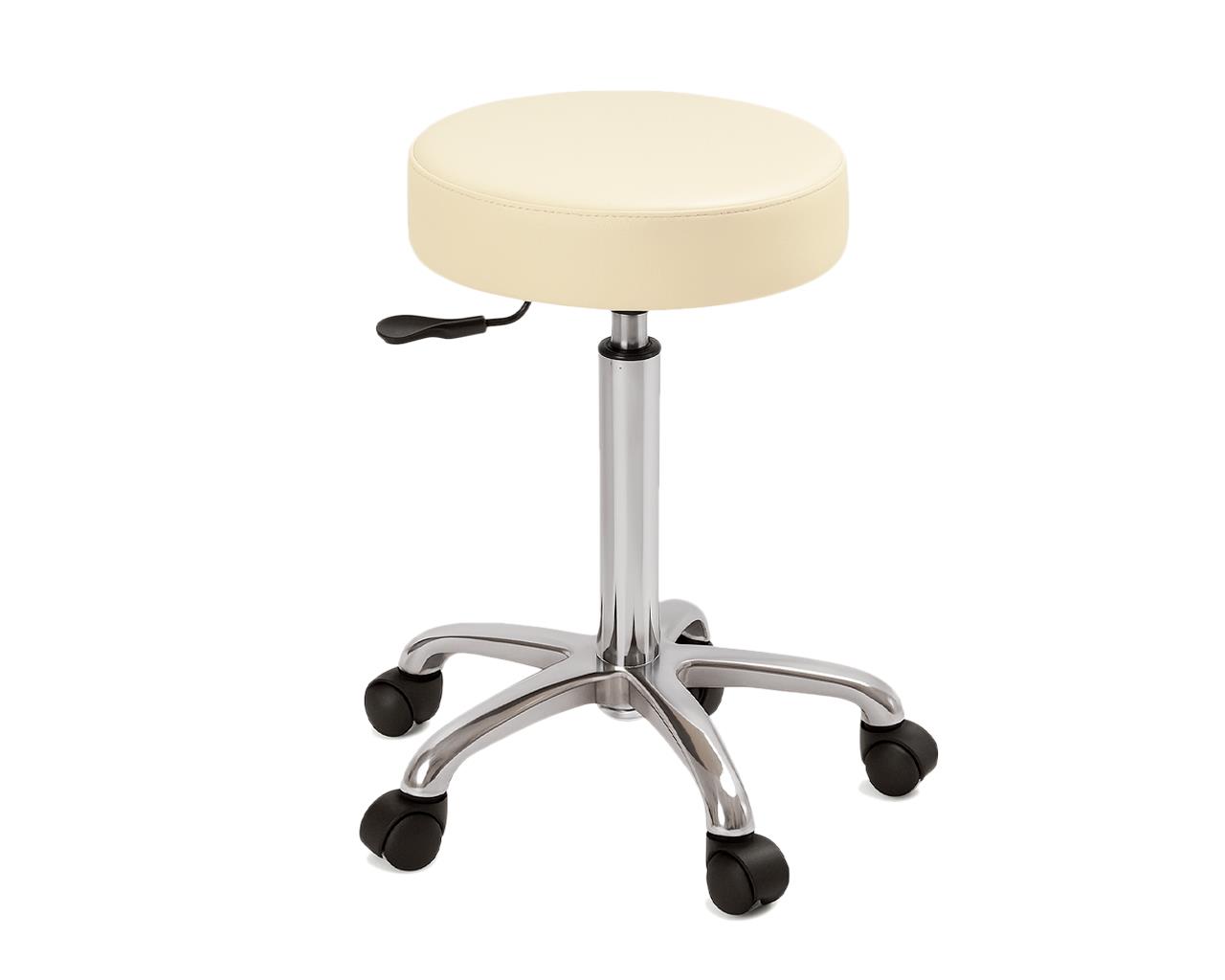 Sgabello in acciaio con sedile imbottito di diametro seduta da 34 cm e rotelle. Regolabile in altezza.