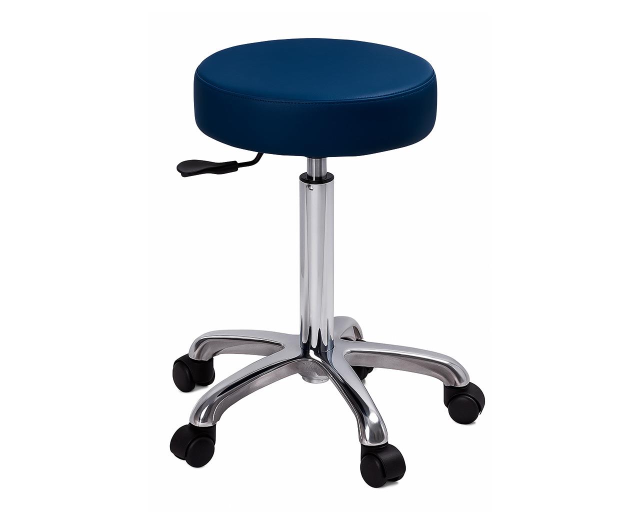 Sgabello in acciaio con sedile imbottito di diametro seduta da 34 cm e rotelle. Regolabile in altezza.