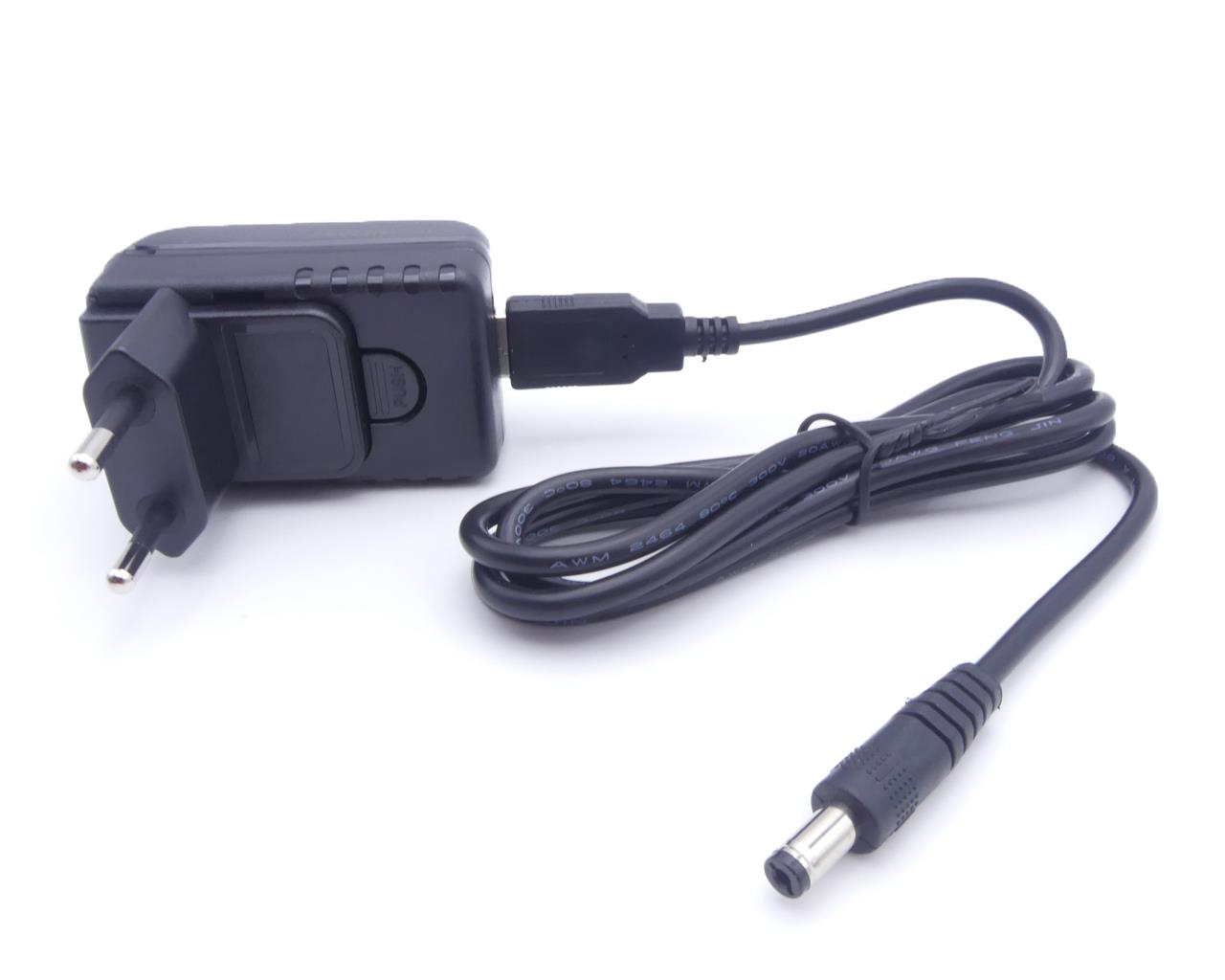 Caricabatterie di ricambio per lampada frontale GIMA LED 40KL, composta da cavo USB e adattore per presa a muro.