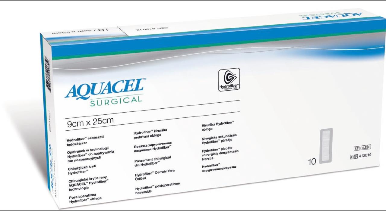 Aquacel® Surgical è una medicazione sterile composta da lamine di idrocolloide e film di poliuretano con tampone centrale assorbente (da porre a contatto con la linea di sutura) a base di fibre di carbossimetilcellulosa sodica (Tecnologia Hydrofiber®) contenente Elastane e Nylon.