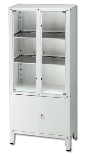 Armadieo in acciaio verniciato con scomparti superiori. Gli scomparti superiori hanno ante incernierate in vetro temperato con lucchetto, chiave e 2 ripiani regolabili in altezza.