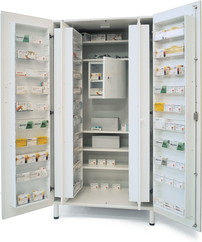 Armadio portamedicinali in bilaminato, con mobiletto stupefacenti, 48 scomparti porta farmaci e 5 ripiani regolabili.