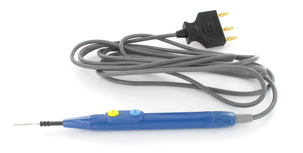 Manipolo per elettrochirurgia autoclavabile fino a 100 volte con due pulsanti per taglio e coagulo (CUT e COAG), dotato di elettrodo e cavo.
