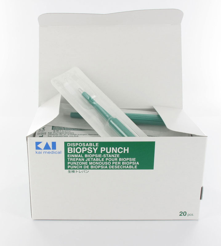 Punch per biopsia senza latex, monouso sterili, dotate di lama in acciaio inossidabile, molto affilata, e di manico in plastica. Sul punch è marcata la misura per una più facile identificazione.