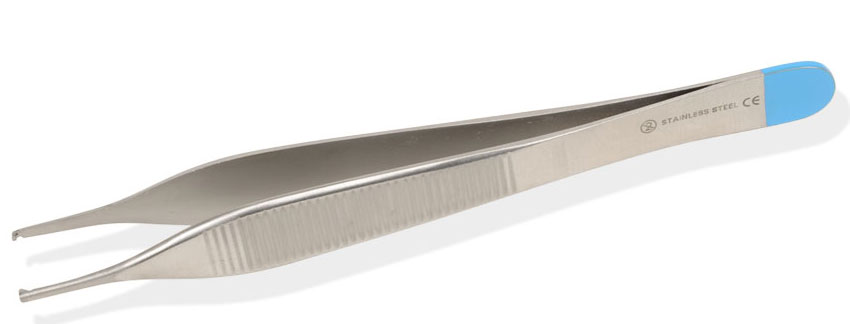 Pinze Adson chirurgiche sterili (sterilizzato con radiazioni Gamma) monouso, caratterizzate da una parte di colore blu per differenziarlo dagli strumenti riutilizzabili.