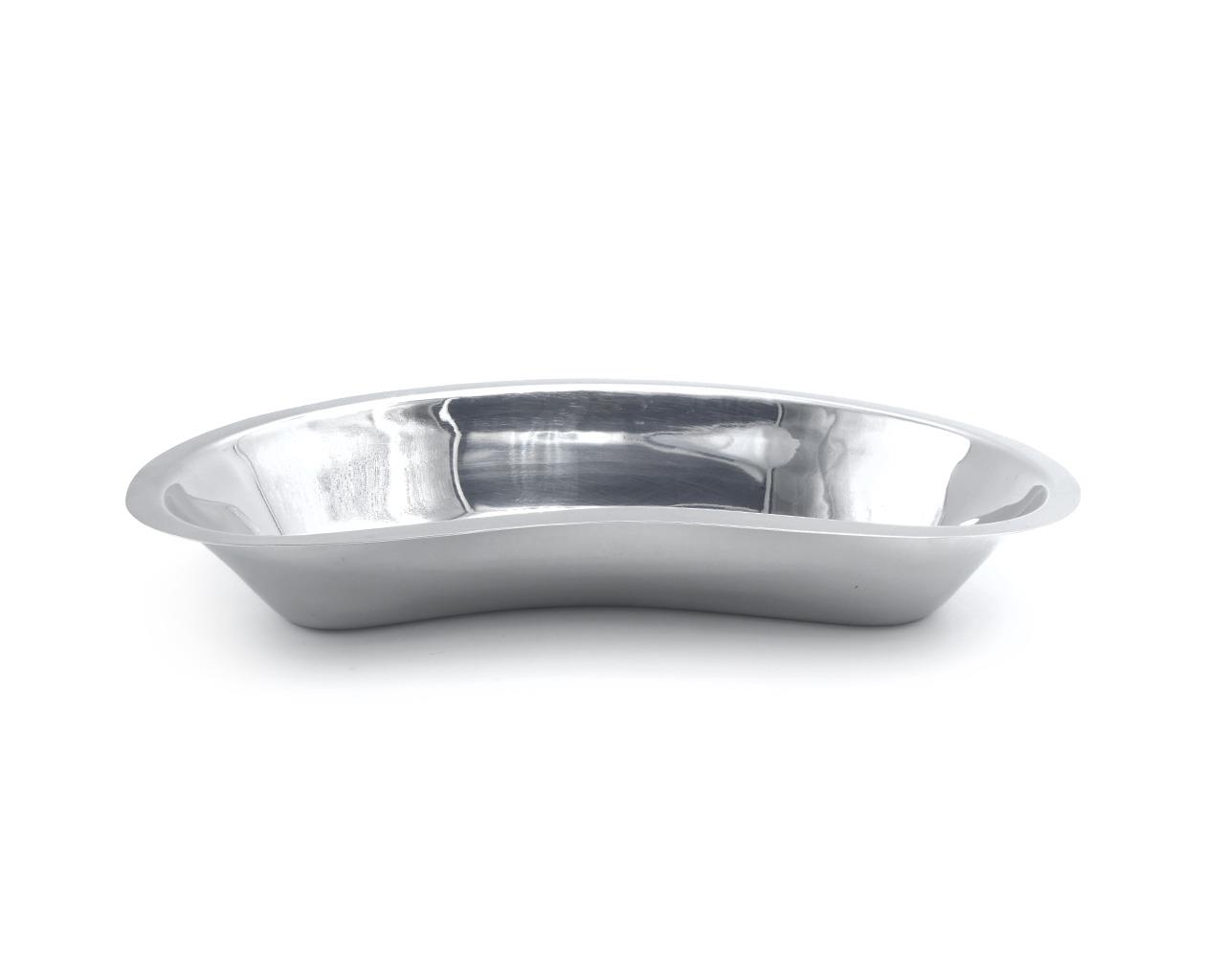 Bacinella reniforme in acciaio inox AISI 202 con bordi alti, destinata all'impiego nel contesto sanitario e di laboratorio. Strumento non chirurgico.