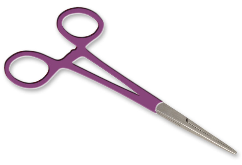 Pinza arteria in acciaio con anelli lilla.