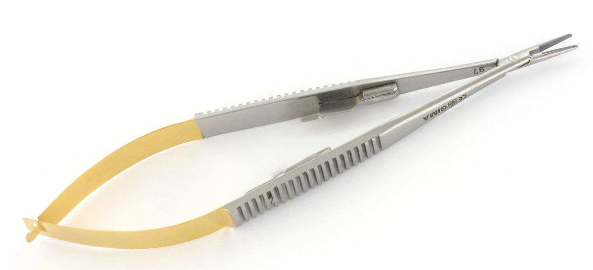 Porta aghi micro Castroviejo retto a punta liscia, in carburo di tungsteno.