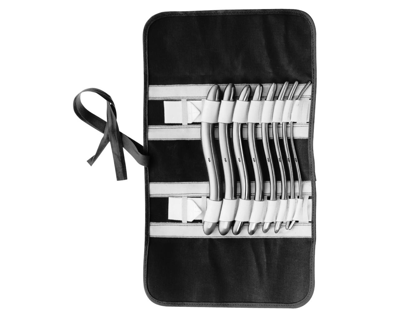 Set comprensivo di dilatatori uterini Hegar di varie misure, contenuti in una busta di tela.