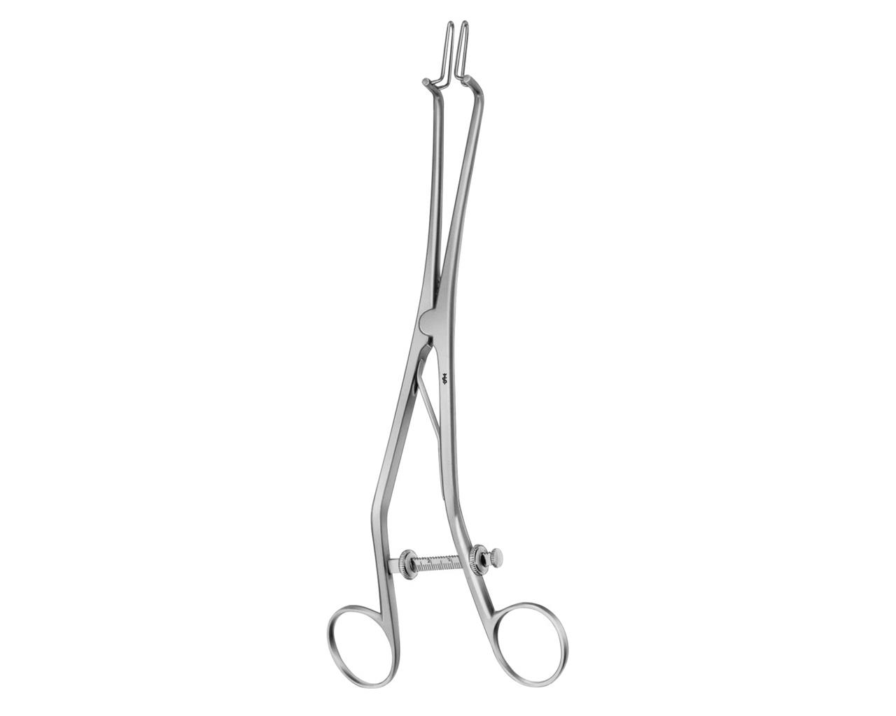 Dilatatore uterino Kogan con cremagliera graduata e vite di controllo, in acciaio inox.