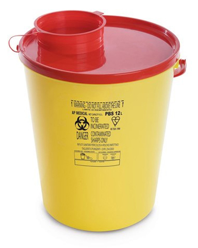 Contenitore monouso modello PBS, resistente alla perforazione, di forma cilindrica per lo smaltimento dei rifiuti acuminati e taglienti. La chiusura definitiva e inviolabile che impedisce la fuoriuscita dei rifiuti e l’alta resistenza del contenitore garantiscono elevata qualità. Tutti i modelli sono dotati di maniglia e i modelli più grandi anche di un'impugnatura ergonomica.