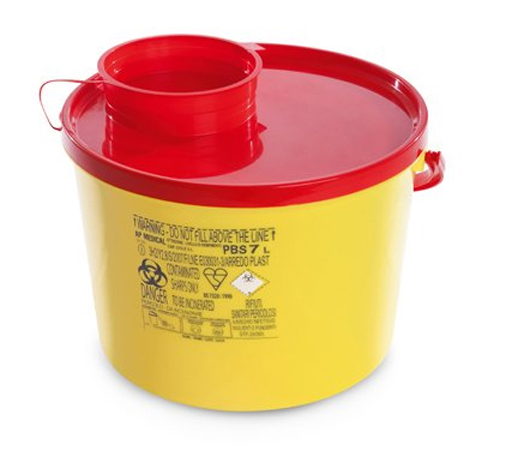 Contenitore monouso modello PBS, resistente alla perforazione, di forma cilindrica per lo smaltimento dei rifiuti acuminati e taglienti. La chiusura definitiva e inviolabile che impedisce la fuoriuscita dei rifiuti e l’alta resistenza del contenitore garantiscono elevata qualità. Tutti i modelli sono dotati di maniglia e i modelli più grandi anche di un'impugnatura ergonomica.