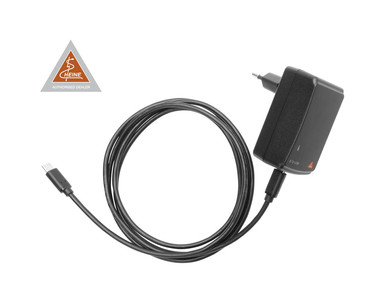 Alimentatore Heine E12-USBC con attacco USB-C in entrambi i lati. Certificato a norma IEC 60601-1.