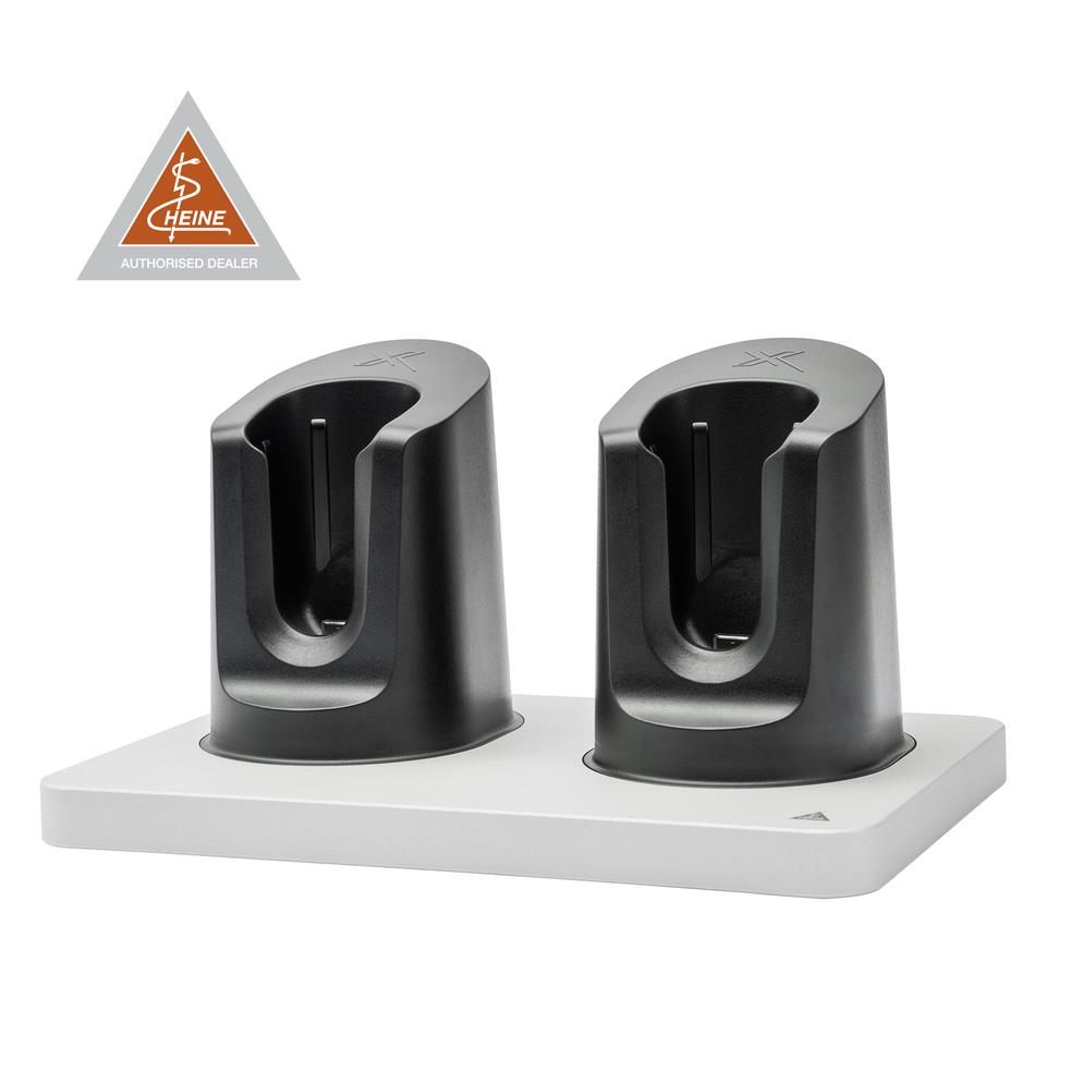 Caricatore da tavolo per due strumenti della serie HEINE X. Con la stazione di ricaroca CS1 Dual due strumenti, come l’otoscopio e l’oftalmoscopio BETA X, possono essere caricati in parallelo insieme.
