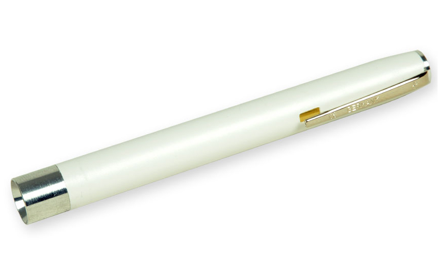 Lucciola a LED in plastica, di colore bianco. Sistema di accensione e spegnimento alla clip da taschino.
