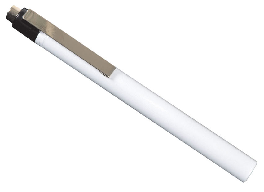 Lucciola alogena in metallo, di colore bianco. Sistema di accensione e spegnimento al pulsante.