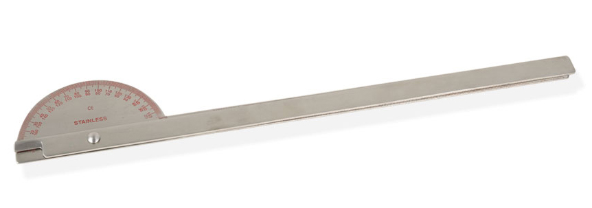 Questo goniometro ha due scale di misurazione opposte da 180° e una da 360° suddivise in 1° ognuna. Robusto pomello consente di controllare la tensione dei bracci.