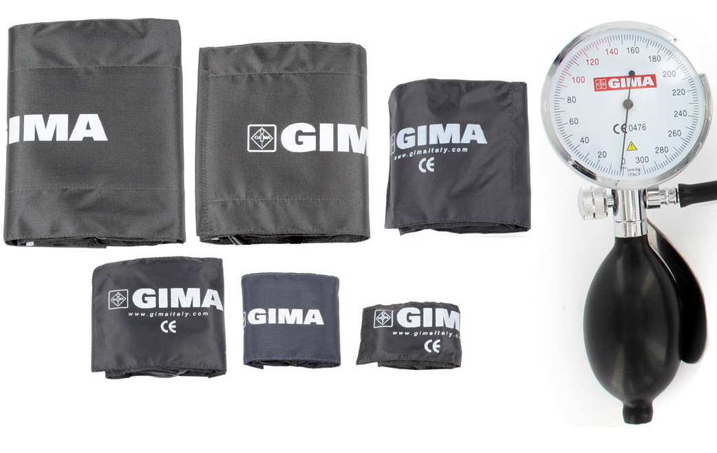 Sfigmomanometro Sirio con 5 bracciali con chiusura velcro e manometro montato sulla soffieria. Grande quadrante per facilitare la lettura.