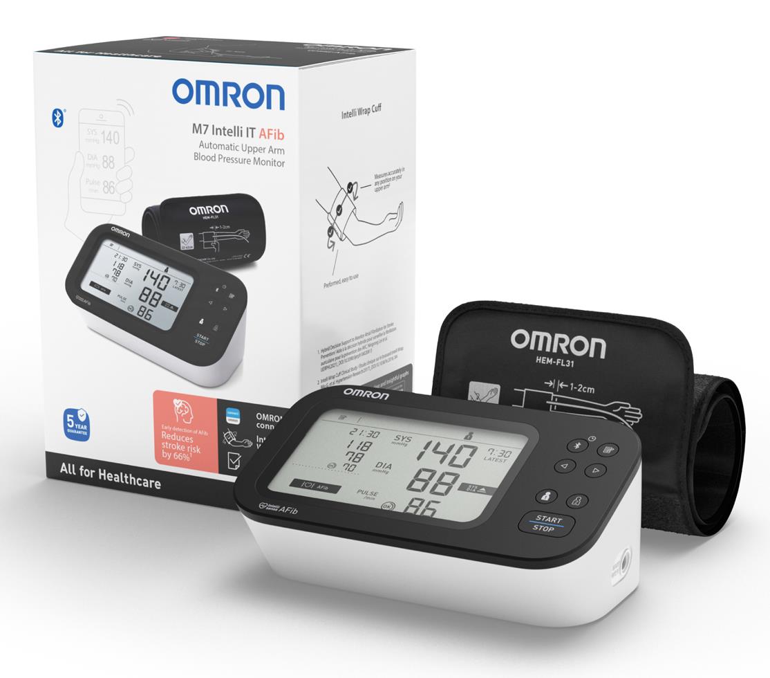 Sfigmomanometro digitale da braccio Omron M7 Intelli IT AFIB, con bracciale Intelli Wrap 22-42 cm. Il bracciale Intelli Wrap si adatta a braccia di dimensioni normali e grandi, eliminando le imprecisioni di lettura correlate al posizionamento errato. Funzione di rilevamento fibrillazione atriale (AFIB).