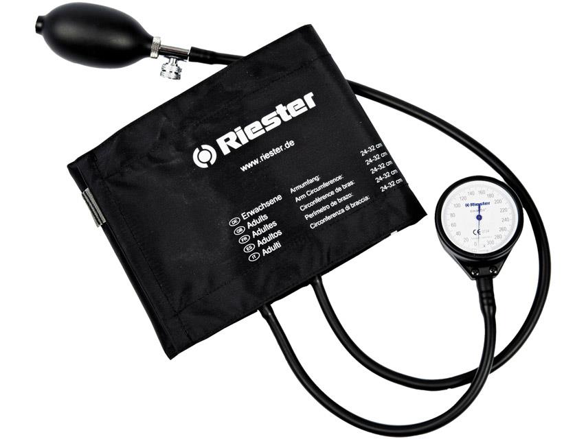 Sfigmomanometro a due tubi dalla linea classica, migliorato nel contenimento del peso, con quadrante in metallo nero laccato.