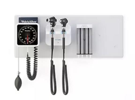 Series 777 con oftalmo Panoptic Plus, otoscopio MacroView Plus, sfigmo aneroide e dispenser specula