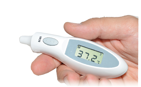 Nuovo termometro da orecchio, piccolo, facile da pulire e dotato di ampio display facile da leggere. Adatto all'uso domiciliare.