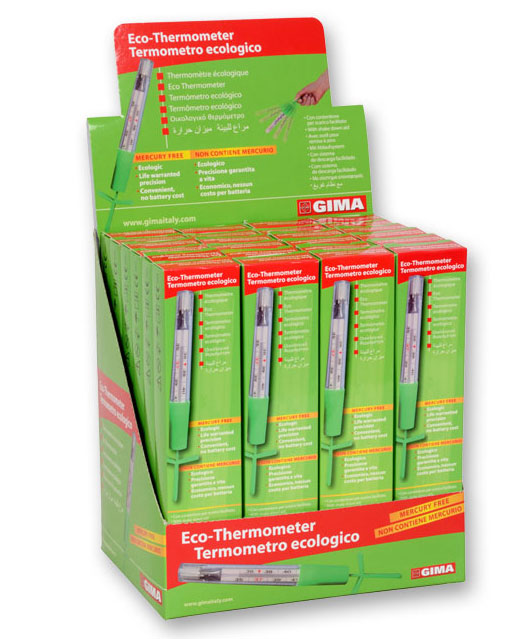 Termometro ecologico con gallio al posto del mercurio, con contenitore "shaker" per scaricare la colonna di gallio dopo l'uso. Corpo in vetro, confezionato in astuccio rigido in plastica.