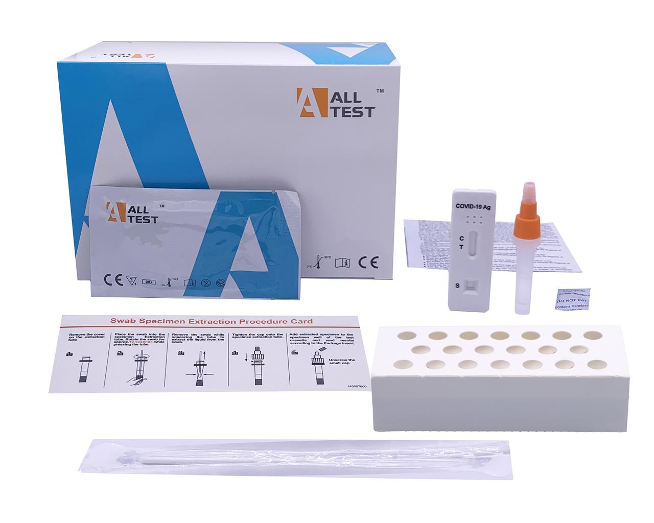 Il kit include: 20 cassette test, 20 tamponi nasofaringei sterili, foglietto illustrativo, stazione di lavoro, tampone di estrazione, scheda procedura e manuale multilingue.