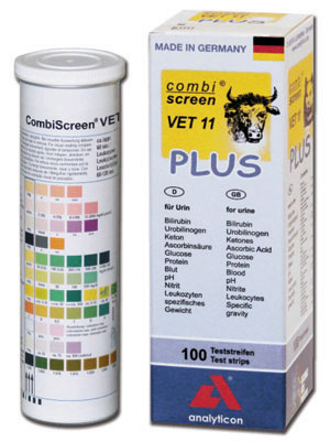 Strisce per urine veterinarie che consentono la valutazione di 11 parametri, con protezione dall'acido ascorbico.