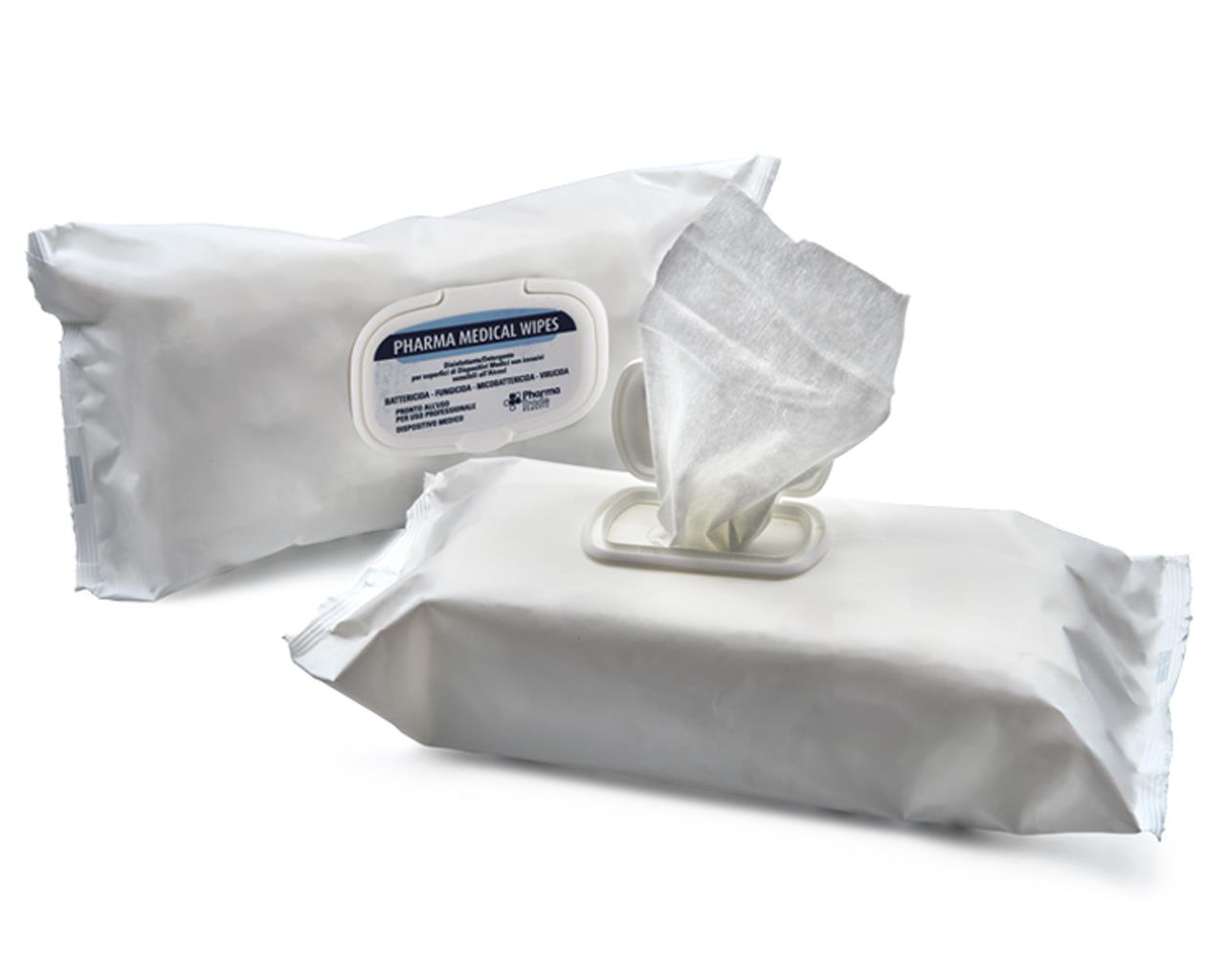 Le salviette Pharma Medical Wipes in tessuto non tessuto sono imbibite di una soluzione disinfettante ad azione battericida, fungicida, micobattericida e virucida per la detersione e la disinfezione pratica e veloce di tutti i Dispositivi Medici non invasivi.
