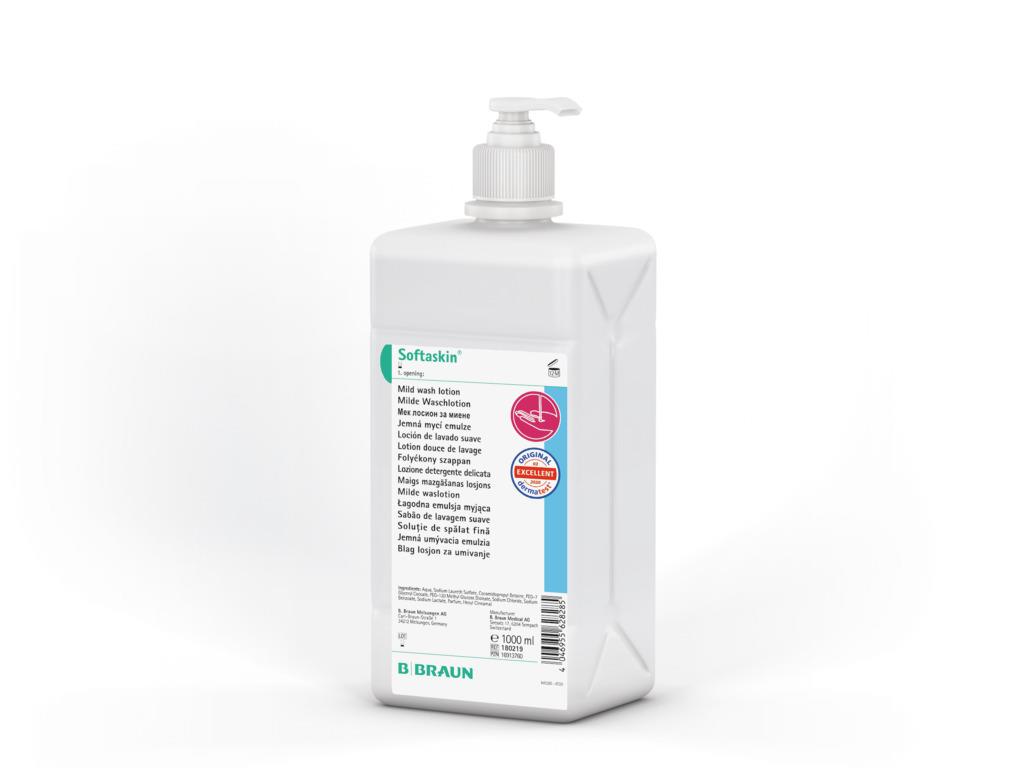 Softaskin® Pure di B. Braun è una lozione detergente pronta all'uso che consente una delicata, profonda ed efficace detersione delle mani e della cute.