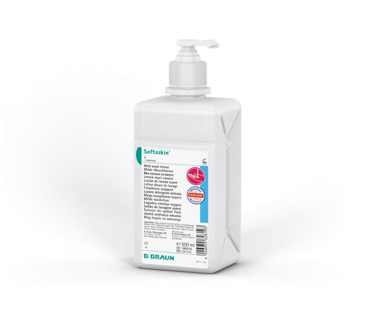 Softaskin® Pure di B. Braun è una lozione detergente pronta all'uso che consente una delicata, profonda ed efficace detersione delle mani e della cute.