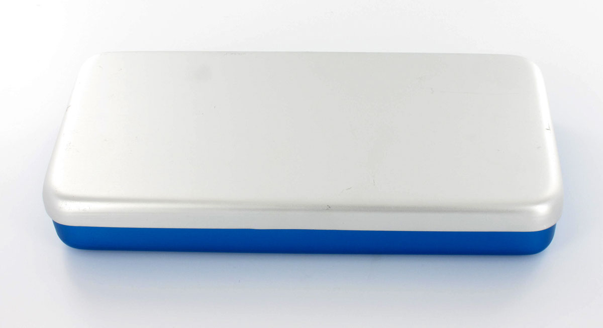 Pratico contenitore per la sterilizzazione degli strumenti e la loro conservazione. Scatola in colore blu con coperchio color argento, alluminio. Tappetino in gomma non incluso.