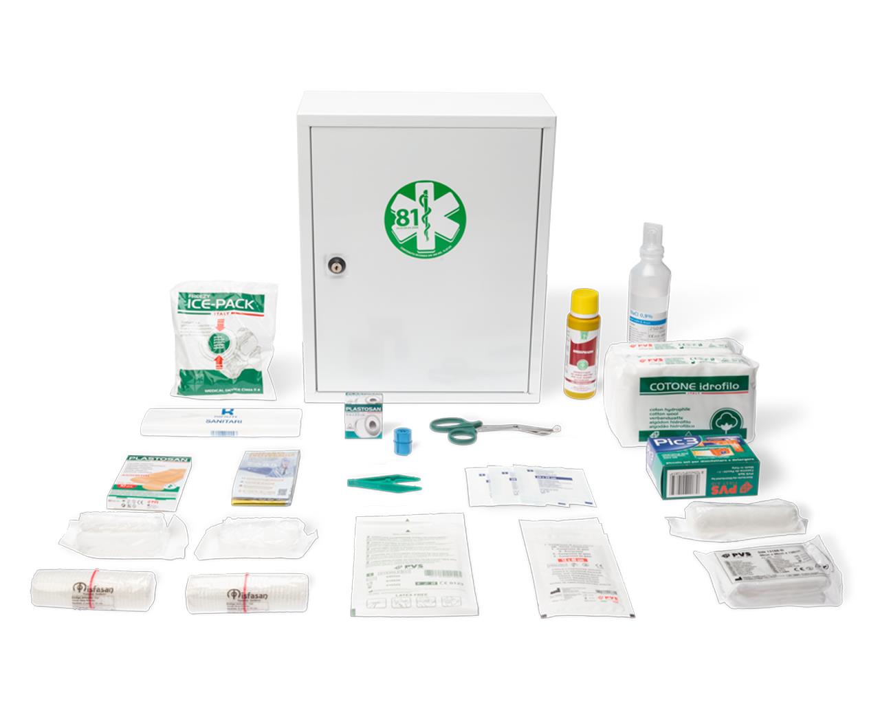 Il prodotto è fornito come pacco medicazione 'maggiorato', in quanto contiene, oltre ai prodotti indicati nel decreto come contento minimo, anche altri articoli utili al primo soccorso e consentiti dal decreto stesso.